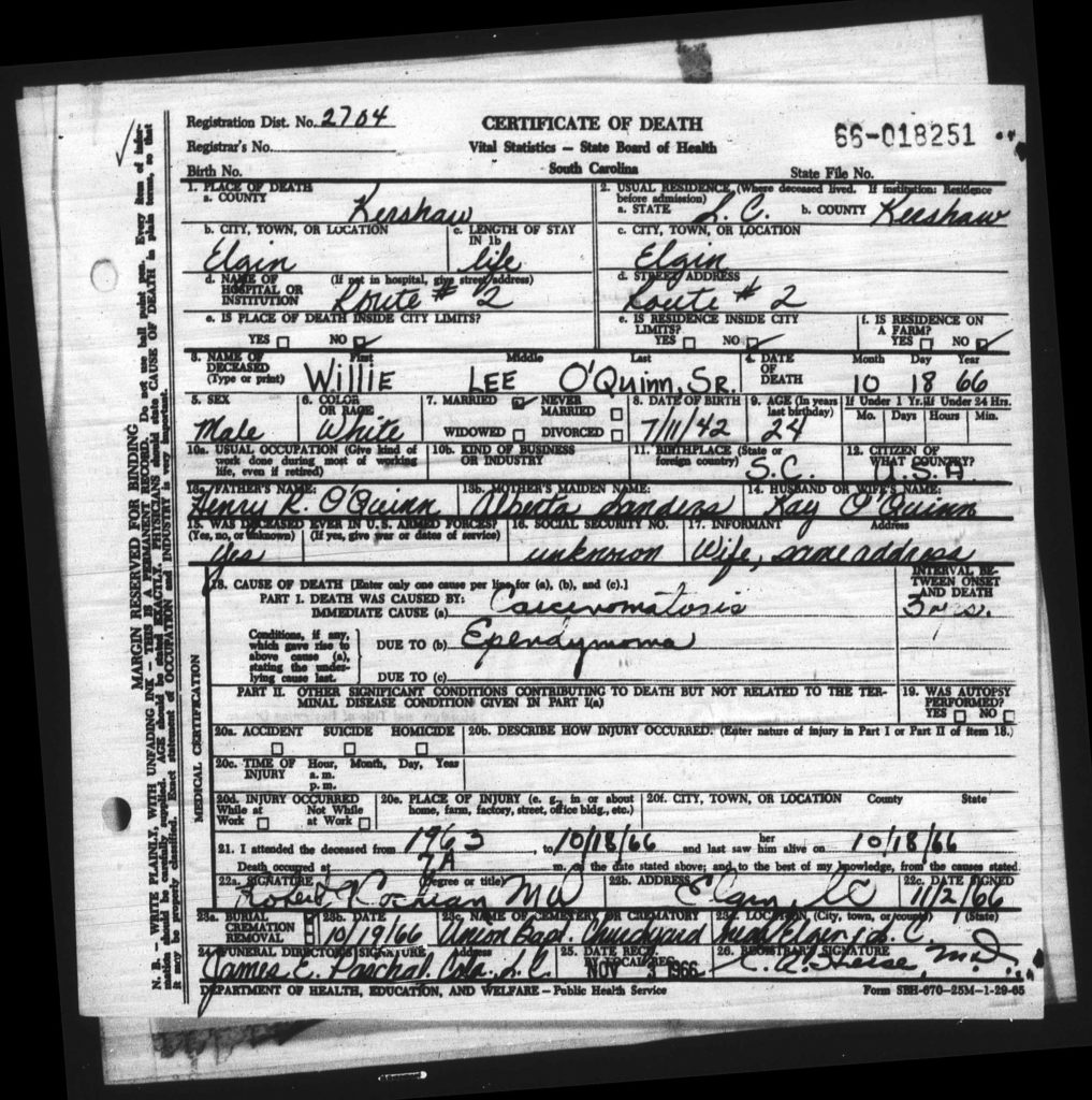On May 18, 2019, Willie Lee O’Quinn was listed as the deceased brother in the obituary of Ruth O’Quinn Coyle.