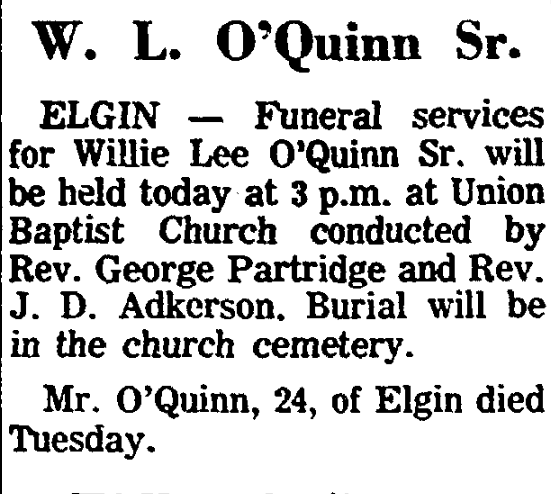 ELGIN – Funeral services for Willie Lee O’Quinn Sr. will be held today, October 19, 1966 at 3 p.m. at Union Baptist Church conducted by Rev. George Partridge and Rev. J. D. Adkerson. Burial will be in the church cemetery.