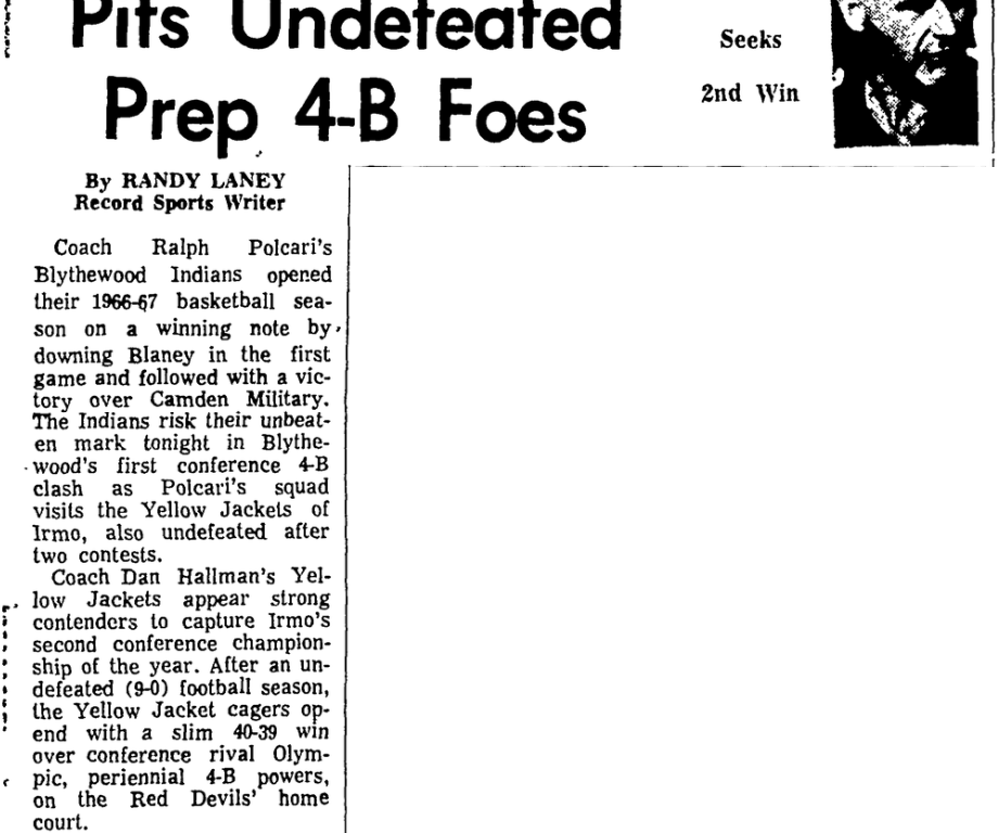 Coach Ralph Polcari’s Blythewood Indians opened their 1966-67 basketball season on a winning note by downing Blaney in the first game and followed with a victory over Camden Military. The Indians risk their unbeaten mark tonight in Blythewood’s first conference 4-B clash as Polcari’s squad visits the Yellow Jackets of Irmo, also undefeated after two contests.