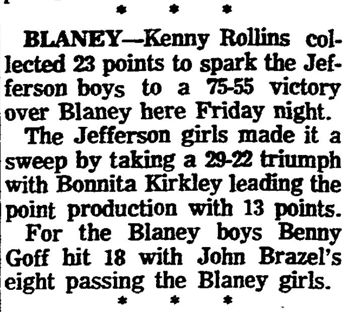 BLANEY – Kenny Rollins collected 23 points to spark the Jefferson boys to a 75-55 victory over Blaney here Friday night.