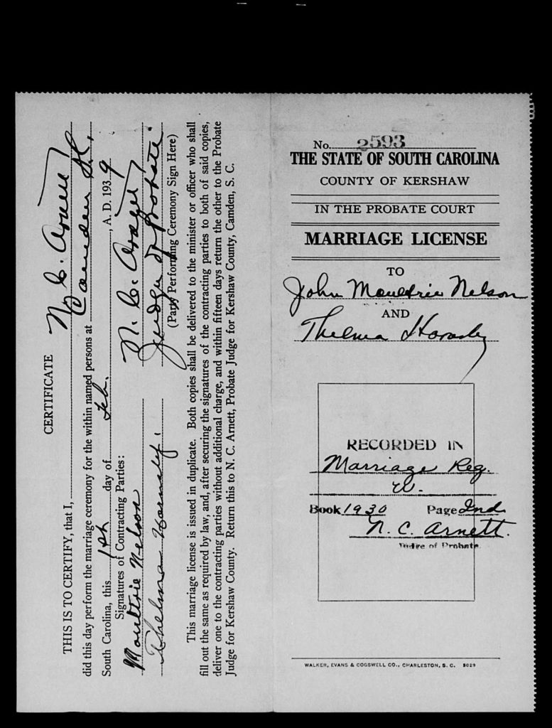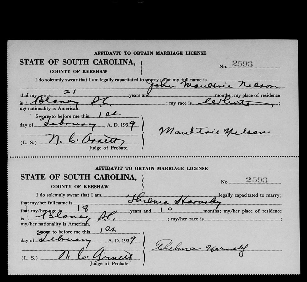 When he was 17, he married Thelma Hornsby, daughter of Joseph T. Hornsby and Emily Bowen, on 01 Feb 1939 in Kershaw, South Carolina, USA.