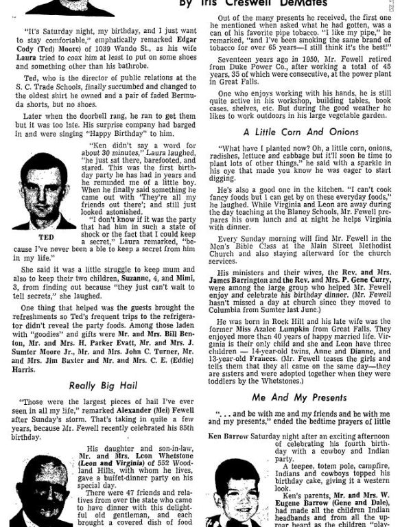 He was born in Rock Hill and his late wife was the former Miss Azalee Lumpkin from Great Falls. They enjoyed more than 40 years of happy married life. Virginia is their only child and she and Leon have three children – 14-year-old twins, Anne and Dianne, and 13-year-old Frances. (Mr. Fewell teases the girls and tells them that they all came on the same day – they are sisters and were adopted together when they were toddlers by the Whetstones.)
