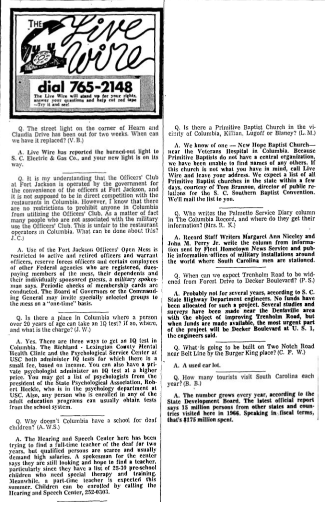 A. We know of one – New Hope Baptist Church – near the Veterans Hospital in Columbia. Because Primitive Baptists do not have a central organization, we have been unable to find names of any others. If this church is not what you have in mind, call Live Wire and leave your address. We expect a list of all Primitive Baptist churches in the state within a few days, courtesy of Tom Brannon, director of public relation for the S. C. Southern Baptist Convention. We’ll mail the list to you.