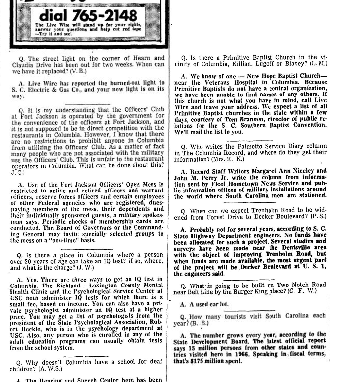 A. We know of one – New Hope Baptist Church – near the Veterans Hospital in Columbia. Because Primitive Baptists do not have a central organization, we have been unable to find names of any others. If this church is not what you have in mind, call Live Wire and leave your address. We expect a list of all Primitive Baptist churches in the state within a few days, courtesy of Tom Brannon, director of public relation for the S. C. Southern Baptist Convention. We’ll mail the list to you.