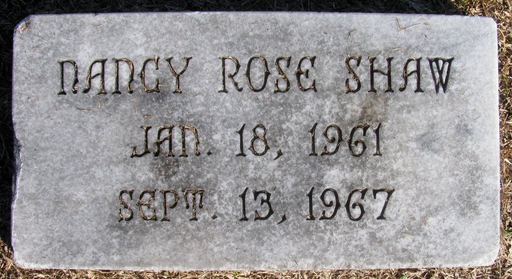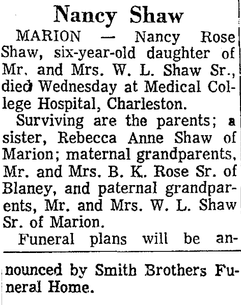 MARION – Nancy Rose Shaw, six-year-old daughter of Mr. and Mrs. W. L. Shaw Sr. (Myra Joyce Rose Shaw), died Wednesday, September 13, 1967 at Medical College Hospital, Charleston.