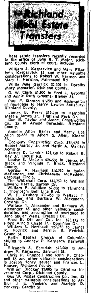 Willie Mae Garrick $3,300 to Dorothy Mary Moncrief, Richland County