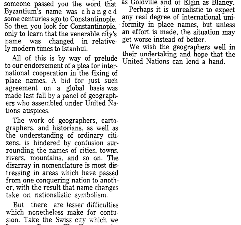 All of this is by way of prelude to our endorsement of a plea for international cooperation in the fixing of place names. A bid for just such agreement on a global basis was made last fall by a panel of geographers to assemble under United Nations auspices.