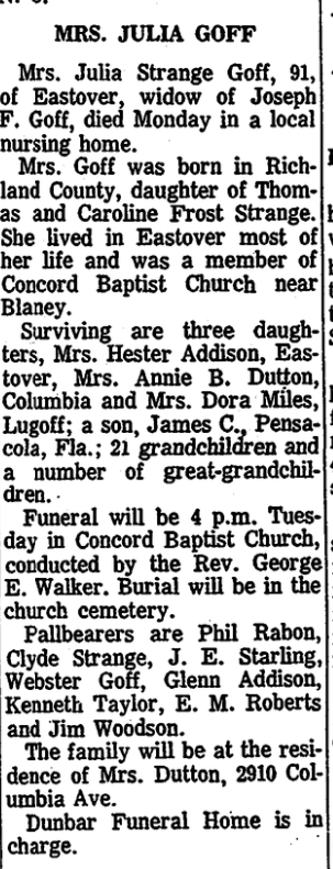 Mrs. Goff was born in Richland County, daughter of Thomas Strange and Caroline Frost Strange. She lived in Eastover most of her life and was a member of Concord Baptist Church near Blaney.