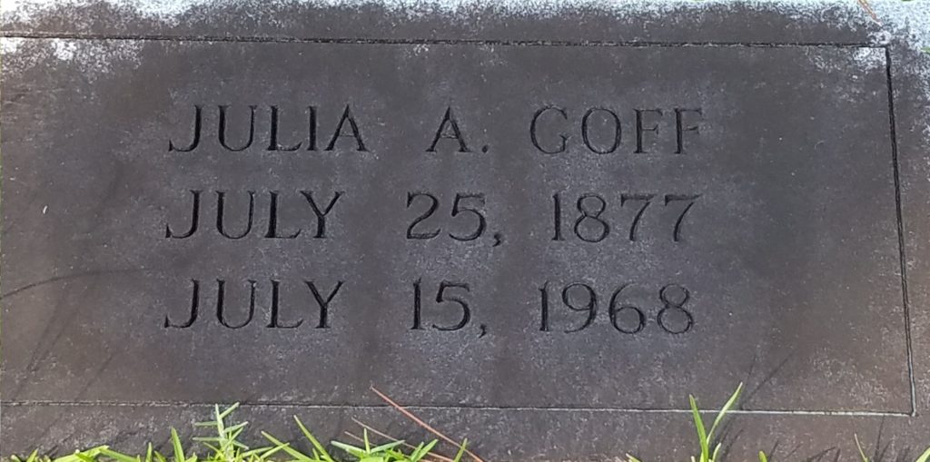 Funeral services for Mrs. Julia Strange Goff were held today in Concord Baptist Church, conducted by the Rev. George Walker. Burial was in the church cemetery.