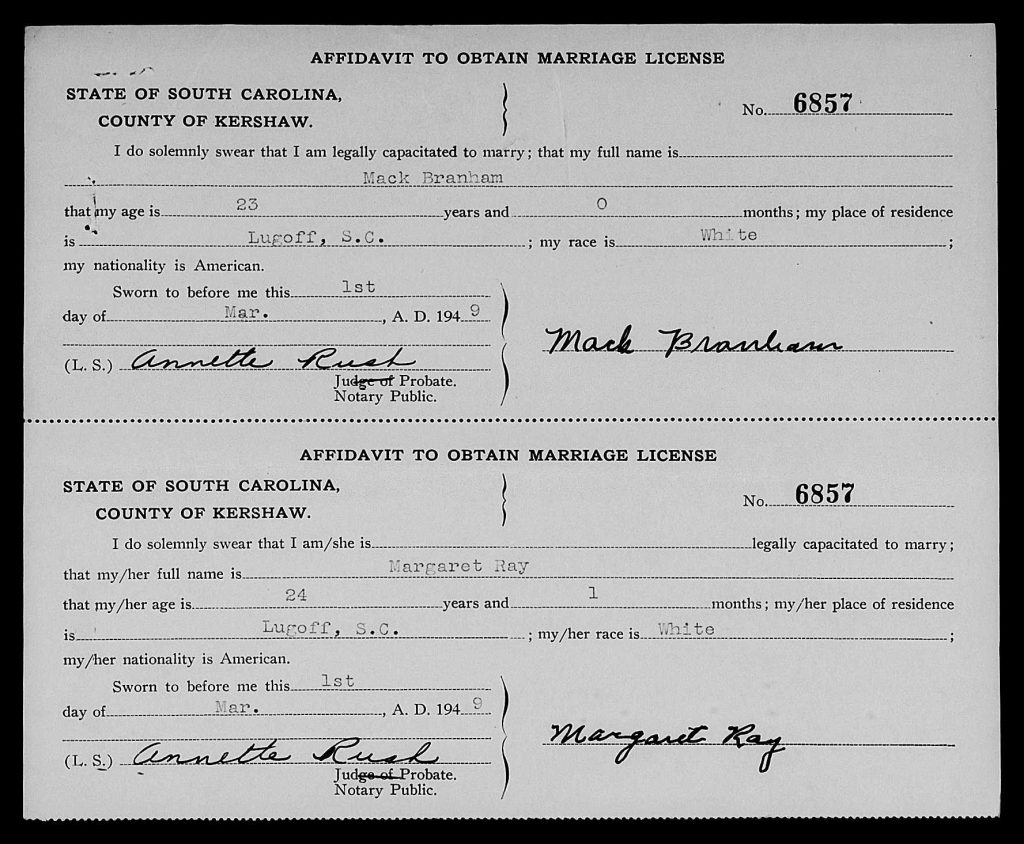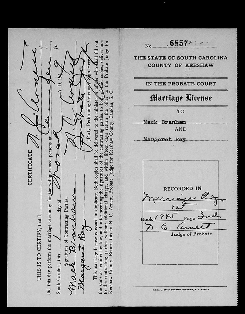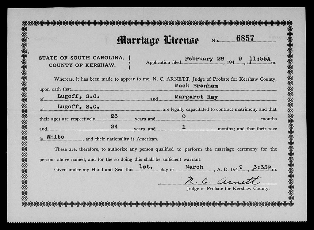When she was 24, she married Mack Douglas Branham on 01 Mar 1949 in Kershaw, South Carolina, USA.