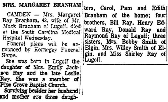 CAMDEN – Mrs. Margaret Ray Branham, 43, wife of Mr. Mack Branham of Lugoff, died at the South Carolina Medical Hospital Wednesday.