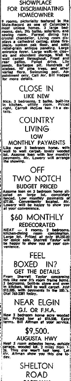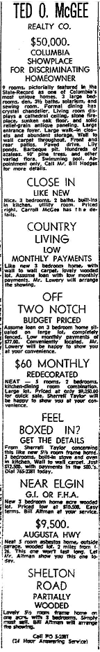 9 rooms, pictorially featured in the State-Record as one of Columbia’s most unique homes. 3 large bedrooms, den, 3 1/2 baths, solarium, and sewing room. formal dining has crystal chandelier. Living room displays a cathedral ceiling, stone fireplace, sunken oak floor, and solid relief-grain antique paneling. Large entrance foyer. Large walk-in closets and abundant storage. Wall to wall carpet throughout. Front and rear patios. Paved drive. Lily Ponds. Barbecue pit. hundreds of azaleas. 90’s pine trees, and other varied flora. Swimming pool. Appointment only. Call Mr. Bill Hodges for more details.