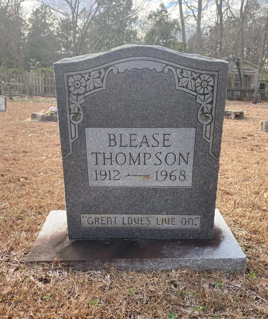 Blease Thompson died on 05 Aug 1968 in Elgin, Kershaw, South Carolina, USA. His cause of death was he was killed when he was struck by a tree, he was cutting. He was buried in Elgin, Kershaw, South Carolina, USA at Fort Clark Baptist Church Cemetery.