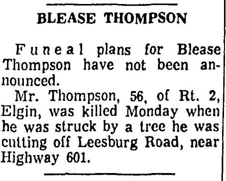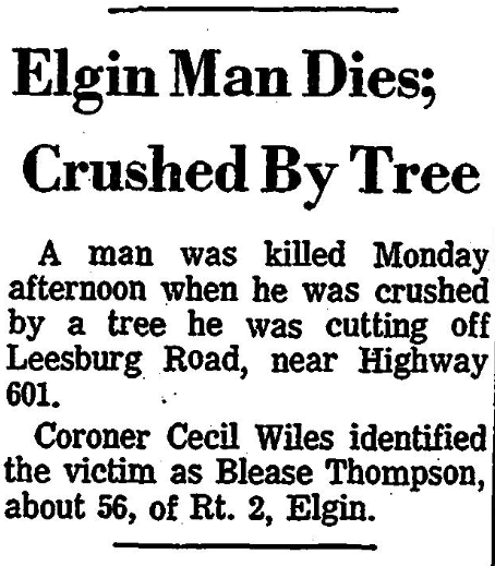 Mr. Thompson, 56, of Rt. 2, Elgin, was killed Monday when he was struck by a tree he was cutting off Leesburg Road, near Highway 601.