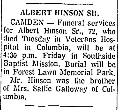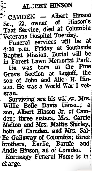 Surviving are his widow, Mrs. Willie Belle Davis Hinson; a son, Albert Hinson Jr. of Camden; three sisters, Mrs. Carrie Melton and Mrs. Mattie Shirley, both of Camden, and Mrs. Sally Galloway of Columbia; three brothers, Earlie Hinson, Burnie Hinson and Andie Hinson, all of Camden.