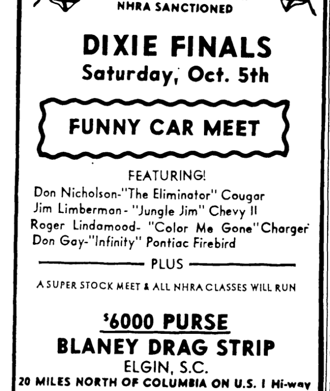 Only 1 Week Away Until The NHRA Sanctioned Dixie FinalsSaturday, Oct. 5th Funny Car Meet FEATURING! Don Nicholson – “The Eliminator” CougarJim Limberman – “Jungle Jim” Chevy IIRoger Lindamood – “Color Me Gone” ChargerDon Gay – “Infinity” Pontiac Firebird Plus A Super stock meet & All NHRA Classes Will Run $6000 Purse Gates open 3 P.M.Eliminations 7 P.M. Classification Closes 6:30 P.M.Funny Car Runs 8 … Continue reading Only 1 Week Away Until The NHRA Sanctioned