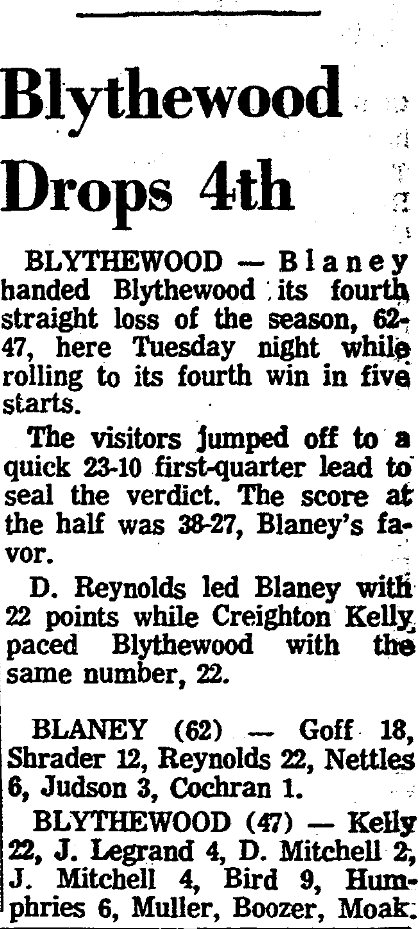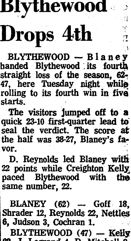 D. Reynolds led Blaney with 22 points while creighton Kelly paced Blythewood with the same number, 22.