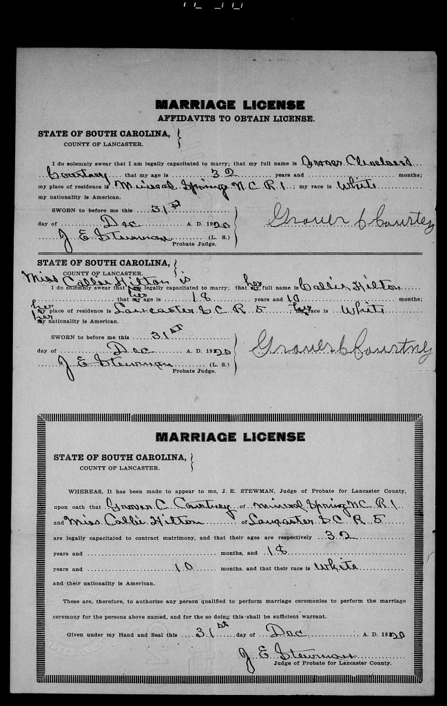 When he was 32, he married Callie H Hilton on 31 Dec 1920 in Lancaster, South Carolina, USA.