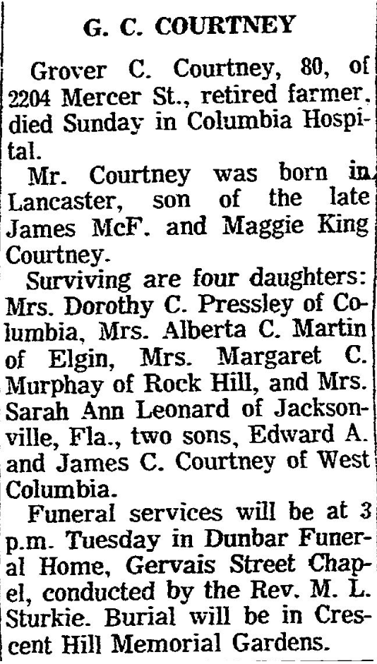 Surviving are four daughters: Mrs. Dorothy C. Pressley of Columbia, Mrs. Alberta C. Martin of Elgin, Mrs. Margaret C. Murphay of Rock Hill, and Mrs. Sarah Ann Leonard of Jacksonville, Fla., two sons, Edward A. and James C. Courtney of West Columbia.