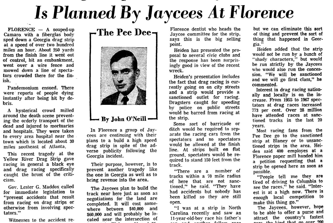In Florence a group of Jaycees are continuing with their plans to build a high speed drag strip in spite of the adverse publicity following the Georgia incident.