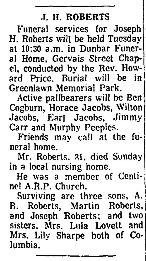Surviving are three sons, A. B. Roberts, Martin Roberts, and Joesph Roberts; and two sisters, Mrs. Lula Lovett and Mrs. Lily Sharpe both of Columbia.