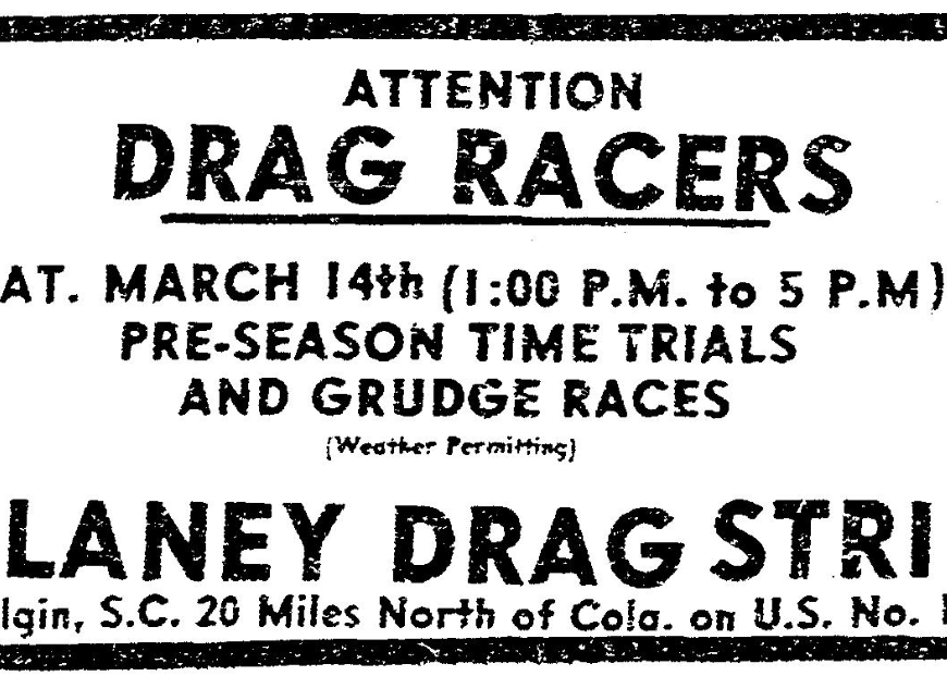 Attention Drag Racers Sat. March 14th (1:00 P.M. to 5 P.M.). PRE-SEASON TIME TRIALS AND GRUDGE RACES (Weather Permitting) BLANEY DRAG STRIP Elgin, S. C. 20 Miles North of Cola. on U. S. No. 1 Continue reading Attention Drag Racers