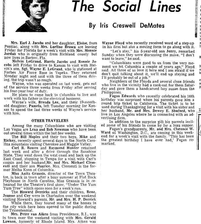 By Iris Creswell DeMates Mrs. Earl J. Jacobs and her daughter, Eloise, from Pontiac, along with Mrs. Lurline Brown are leaving Firday for Florida for a week’s visit with Mrs. Monnie Jordan who is orginally from Richland county but now lives in Bartow, Fla. Melvin LeGrand, Harris Jacobs and Ronnie Jacobs left Friday to drive to Kanas to visit with Melvin’s son, Sgt. Wayne E. … Continue reading The Social Lines