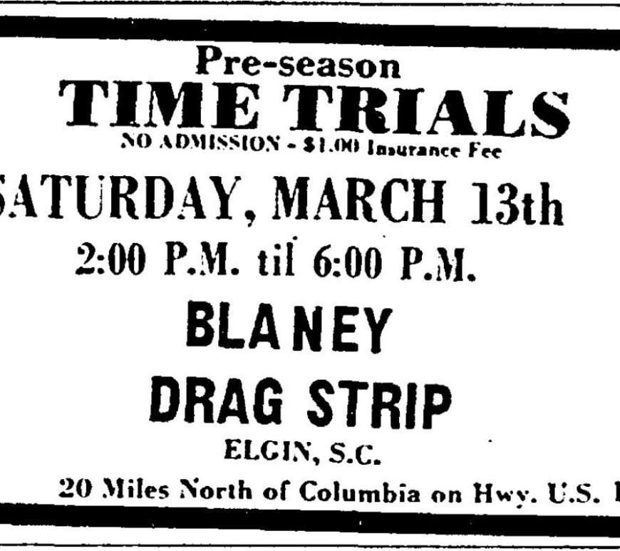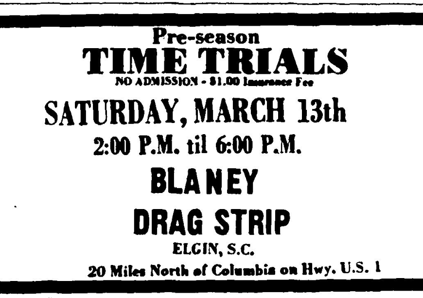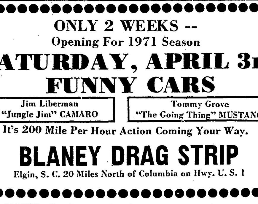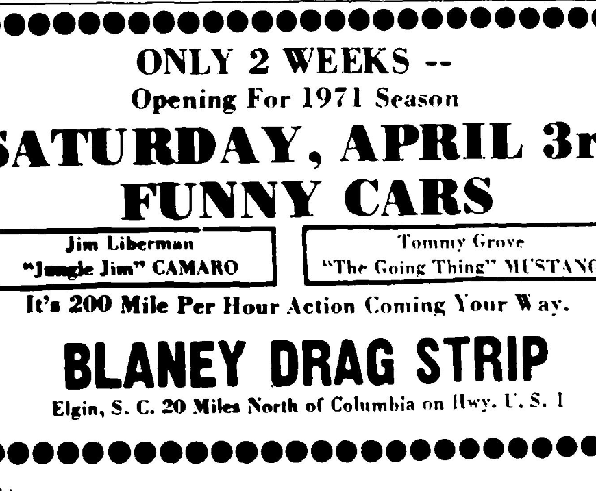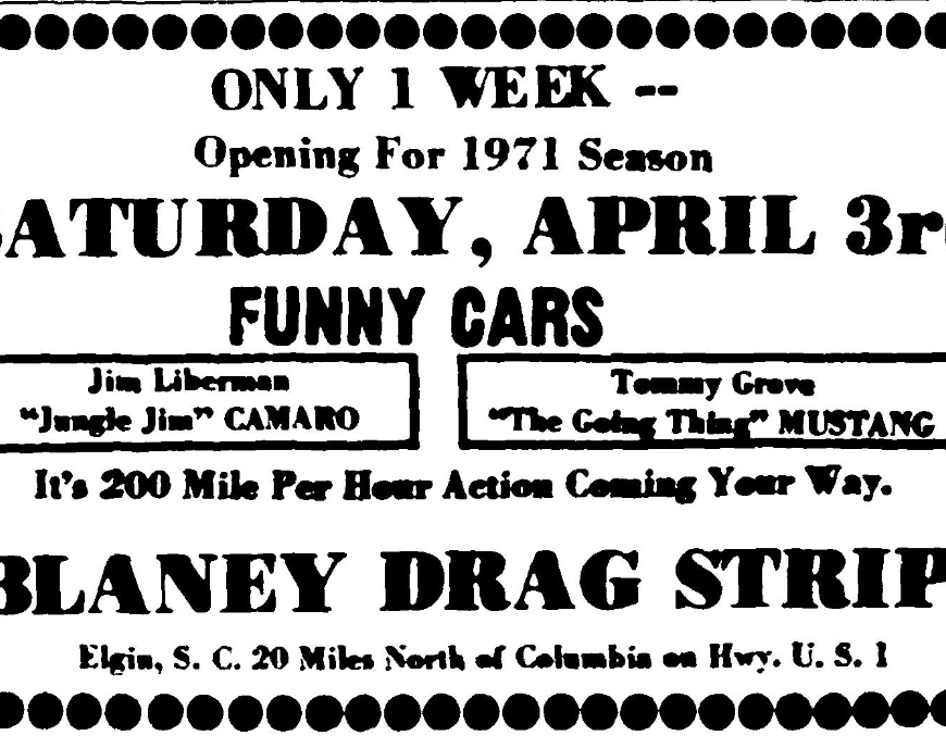 Opening For 1971 Season SATURDAY, APRIL 3rd FUNNY CARS Jim Liberman “Jungle Jim” CAMARO Tommy Grove “The Going Thing” MUSTANG It’s 200 Mile Per Hour Action Coming Your Way. PLUS Over 100 Car Competing In Other NHRA Classes Gate Open at 3:00 P.M. ADMISSION $3.50 Races begin at 7:30 P.M. Children under 12 Free w/parent BLANEY DRAG STRIP ELGIN, S. C. 20 Miles North of … Continue reading Opening For 1971 Season
