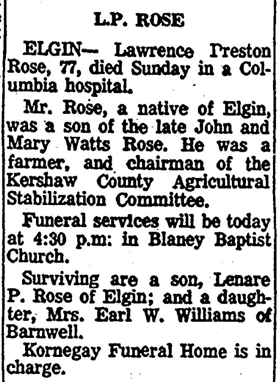 Mr. Rose, a native of Elgin, was a son of the late John Rose and Mary Watts Rose. He was a farmer, and chairman of the Kershaw County Agricultural Stabilization Committee.