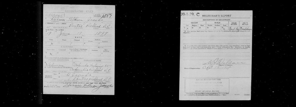 On 12 Sep 1918 in Richland, South Carolina, USA, Horace Tillman Jacobs completed his military draft registration.