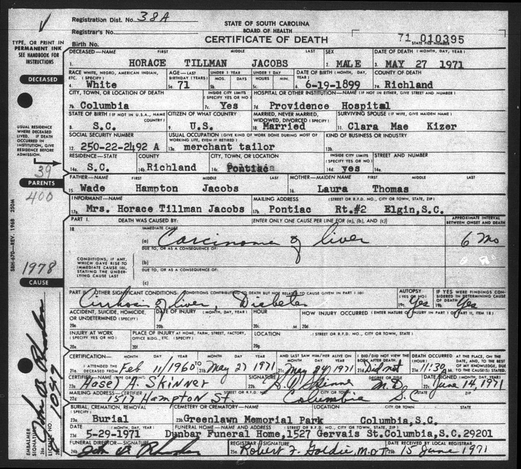He died on 27 May 1971 in Columbia, Richland, South Carolina, USA at Providance Hospital. Horace Tillman Jacobs was buried on 29 May 1971 in Columbia, Richland, South Carolina, USA at Greenlawn Memorial Park.
