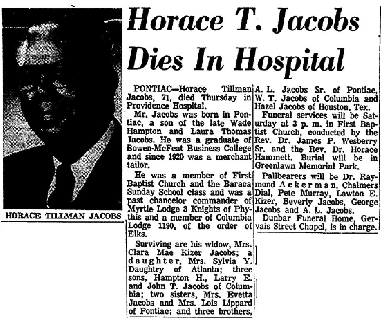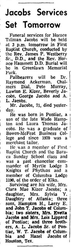Surviving are his wife, Mrs. Clara Mae Kizer Jacobs; a daughter, Mrs. Sylvia Y. Daughtry of Atlanta; three sons, Hampton H., Larry E. and John T. Jacobs of Columbia; two sister, Mrs. Evetta Jacobs and Mrs. Lois Lippard of Pontiac; and three brothers, A. L. Jacobs, Sr., of Pontiac, W. T. Jacobs of Columbia and Hazel Jacobs of Houston, Tex.