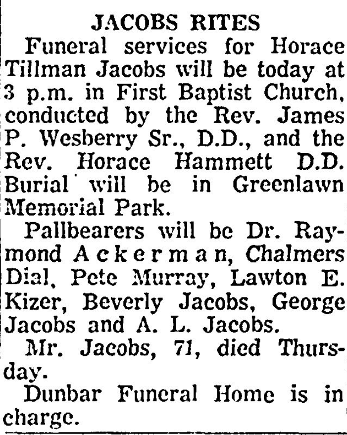 Funeral services for Horace Tillman Jacobs will be held at 3 p.m. tomorrow in First Baptist Church, conducted by the Rev. James P. Westberry Sr., D.D., and the Rev. Horace Hammett D. D. Burial will be in Greenlawn Memorial Park.