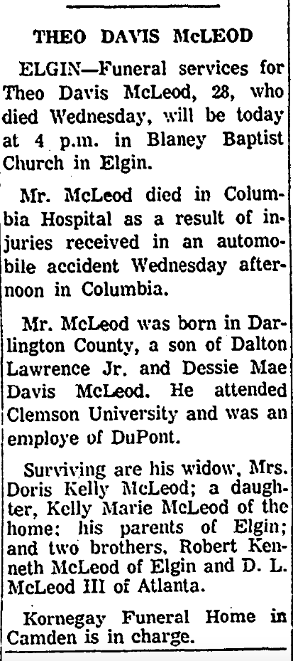 ELGIN – Funeral services for Theo Davis McLeod, 28 who died Wednesday, September 1, 1971 will be today, September 3, 1971 at 4 p.m. in Blaney Baptist Church in Elgin.
