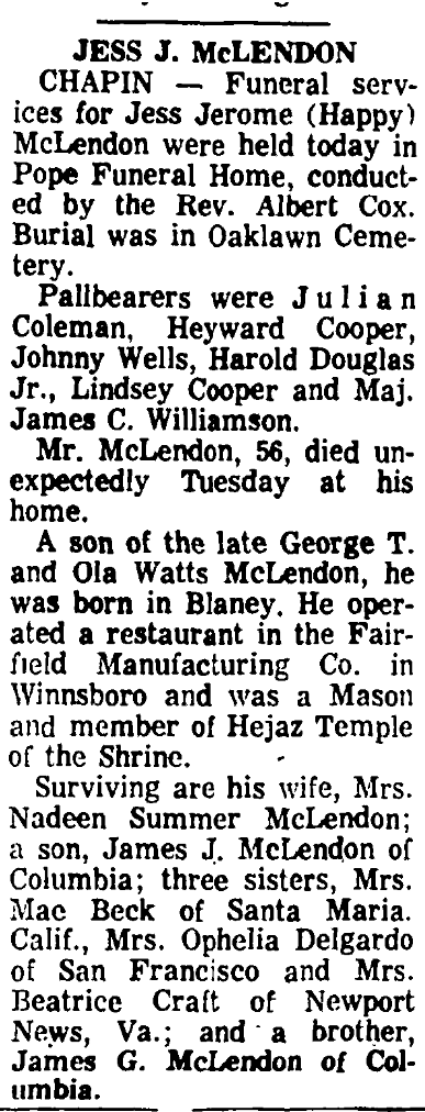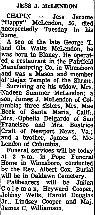 A son of the late George T. McLendon and Ola Watts McLendon, he was born in Blaney. He operated a restaurant in the Fairfield Manufacturing Co. in Winnsboro and was a Mason and member of Hejaz Temple of the Shrine.