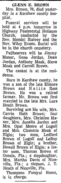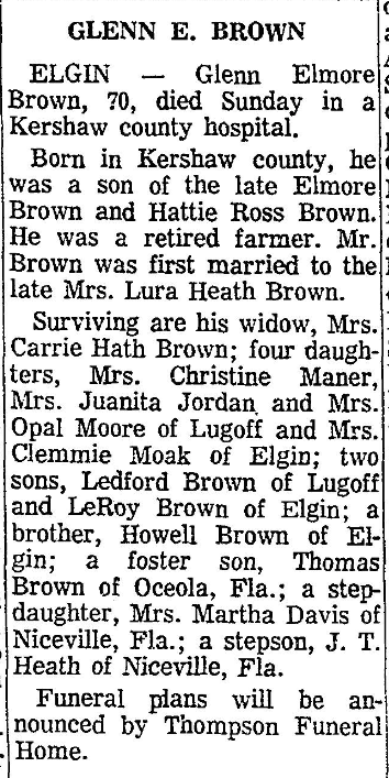 Surviving are his wife, Mrs. Carrie Hath Brown; four daughters, Mrs. Christine Maner, Mrs. Juanita Jordan and Mrs. Opal Moore of Lugoff and Mrs. Clemmie Moak of Elgin; two sons, Ledford Brown of Lugoff, and LeRoy Brown of Elgin; a brother, Howell Brown of Elgin; a foster sons, Thomas Brown of Occola, Fla; a stepdaughter; Mrs. Martha Davis of Niceville, Fla.; a stepson, J. T. Heath of Niceville, Fla.