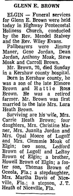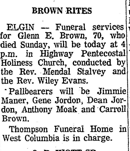 ELGIN – Funeral services for Glenn E. Brown were held today in Highway Pentecostal Holiness Church, conducted by the Reverend Mendel Stalvey and the Reverend Wiley Evans.