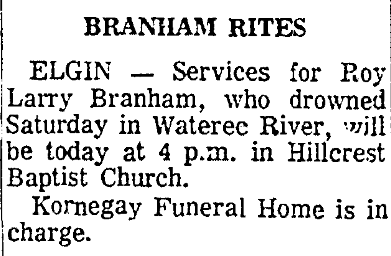 On March 28, 1972, Roy Larry Branham was listed in newspaper article “Elgin Man Drowns In Boating Mishap.“