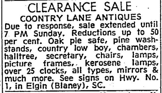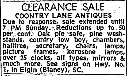 CLEARANCE SALE COUNTRY LANE ANTIQUES Due to response, sale extended until 7 PM Sunday. Reductions up to 50 per cent. Oak pie safe, pine washstands, country low boy, chambers, halltree, secretary, chairs, lamps, picture frames, kerosene lamps, over 25 clocks, all types, mirrors & much more. See signs on Hwy. No. 1, in Elgin (Blaney), SC. Continue reading Antiques