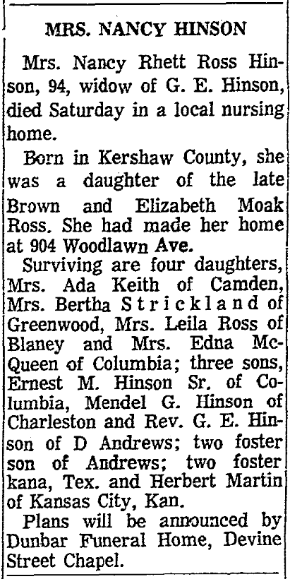 Surviving are four daughters, Mrs. Ada Keith of Camden, Mrs. Bertha Strickland of Greenwood, Mrs. Leila Ross of Blaney and Mrs. Edna McQueen of Columbia; three sons, Ernest M. Hinson Sr. of Columbia, Mendel G. Hinson of Charleston and Rev. G. E. Hinson of D. Andrews; two foster sons of Andrews; two foster children of Arkana, Tex. and Herbert Martin of Kansas City, Kan.