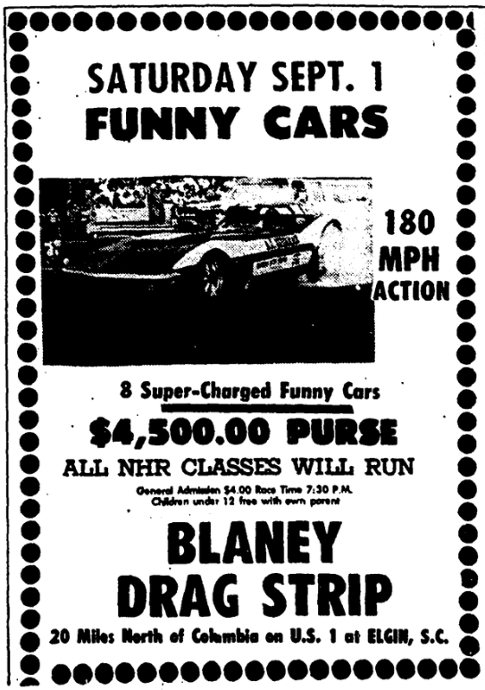 Saturday Sept. 1Funny Cars 180 MPH Action 8 Super-Charged Funny Cars $4,500.00 Purse All NHRA Classes will run GENERAL ADMISSION $4.00 – Race Time 7:30 P.M. Children under 12 Free with own parent BLANEY DRAG STRIP 20 Miles North of Columbia on U. S. 1 at ELGIN, S. C. Continue reading Saturday Sept. 1