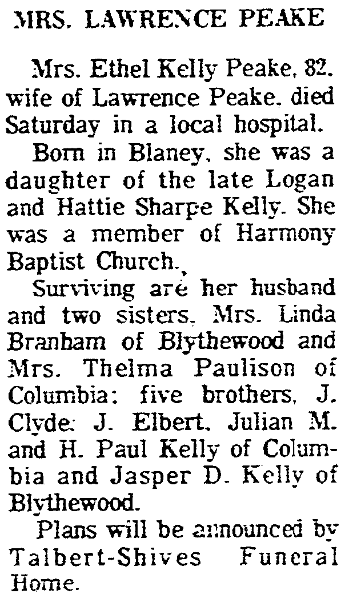 On August 21, 1971, Mrs Ethel Peak was mentioned as a living sister in the obituary of Mr Charlie W Weldon Kelly.