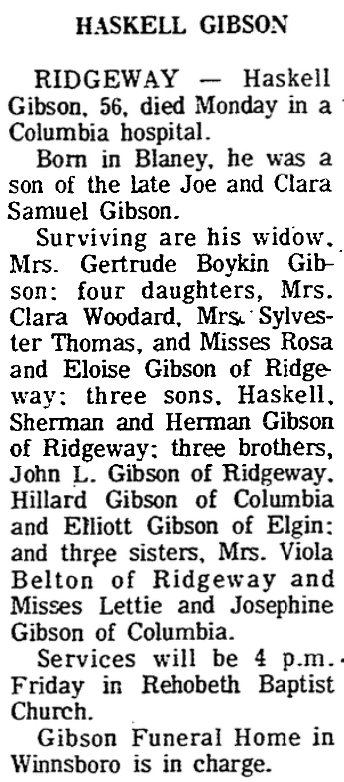 Surviving are his widow, Mrs. Gertrude Boykin Gibson; four daughters, Mrs. Clara Woodward, Mrs. Sylvester Thomas, and Misses Rosa Gibson and Eloise Gibson of Ridgeway; three sons, Haskell Gibson, Sherman Gibson and Herman Gibson of Ridgeway; three brothers; John L. Gibson of Ridgeway, Hillard Gibson of Columbia and Elliott Gibson of Elgin; and three sisters, Mrs. Viola Belton of Ridgeway and Misses Lettie Gibson and Josephine Gibson of Columbia.