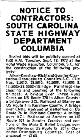 Aiken-Kershaw-Richland-Sumter-Clarendon-Orangeburg Counties – S. C. File Nos. 2.5010, 28.5010, 40.5009, 43,5005 & 14.5005 – 38.5003 – (Bridge Painting) – the cleaning and painting of the following bridges; a bridge over Three Runs Creek on US Route 278 in Aiken County; US Route 1 in Kershaw County; A bridge over CN&L Railroad at Ballentine on US Route 76 in Richland County; A bridge over ACL Railroad at Sumter on US Route 521 in Sumter County; and portions of the Main & Relief bridges over Lake Marion on US Route 13 301 in Clarendon-Orangeburg Counties. Cost of proposal – $2.00.