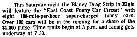 This Saturday night the Blaney Drag Strip in Elgin will feature the “East Coast Funny Car Circuit” with eight 180-mile-per-hour super-charged funny cars. Over 100 cars will be in the running for a share of the $4,000 purse. Time trails begin at 3 p.m. and racing gets underway at 7:30.