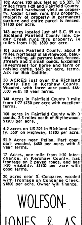 100 acres in Fairfield County with 3 ponds, 2.5 miles north of Blythewood, $1200 per acre.