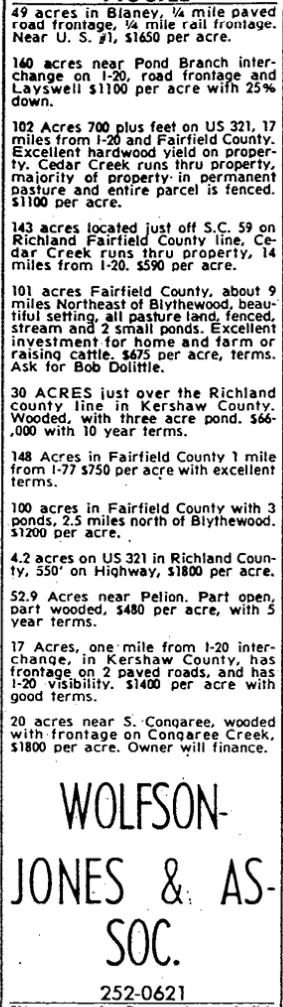101 acres Fairfield County, about 9 miles Northeast of Blythewood, beautiful setting, all pasture land, fenced, stream and 2 small ponds. Excellent investment for home and farm or raising cattle. $675 per acre, terms. Ask for Bob Dolittle.