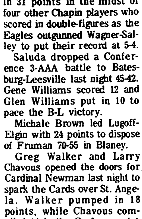 Saluda dropped to Conference 3-AAA battle to Batesburg-Leesville last night 45-42. Gene Williams scored 12 and Glen Williams put in 10 to pace the B-L victory.
