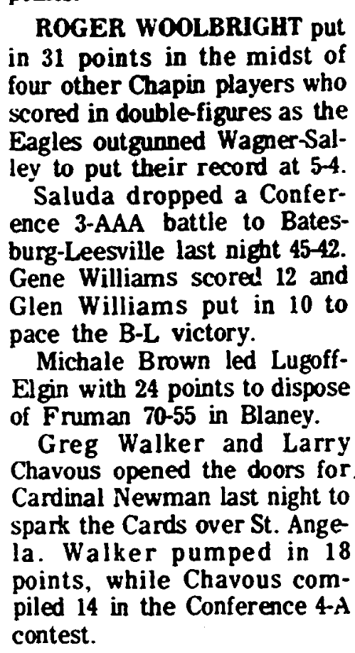 Roger Woolbright put in 31 points in the midst of four other Chapin players who scored in double-figures as the Eagles outgunned Wagner-Salley to put their record at 5-4.