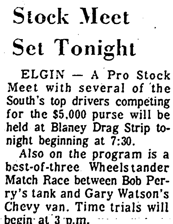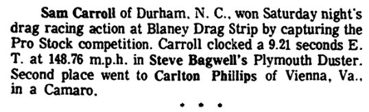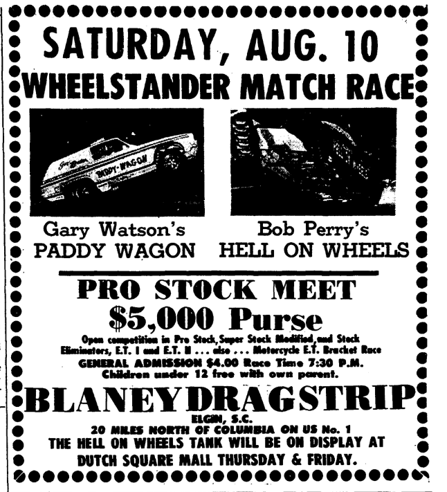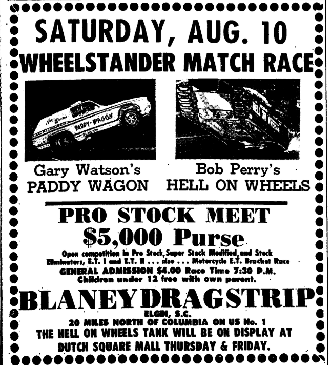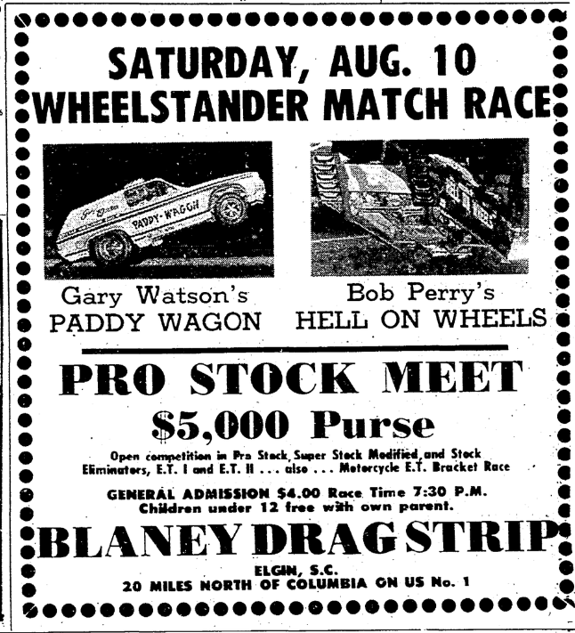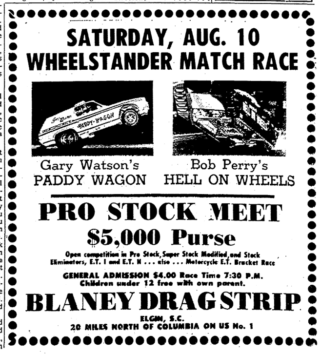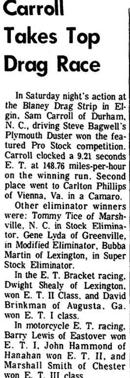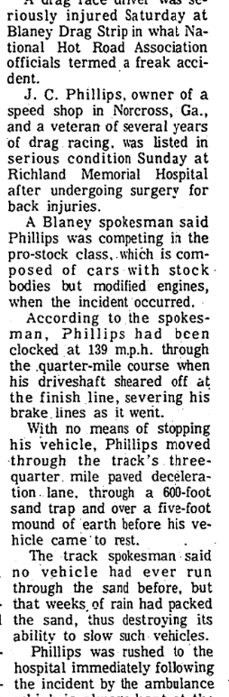 A drag race driver was seriously injured Saturday at Blaney Drag Strip in what National Hot Road Association officials termed a freak accident. J. C. Phillips, owner of a speed shop in Norcross, Ga., and a veteran of several years of drag racing, was listed in serious condition Sunday at Richland Memorial Hospital after undergoing surgery for back injuries. A Blaney spokesman said Phillips was … Continue reading Drag Race Driver Injured In Accident